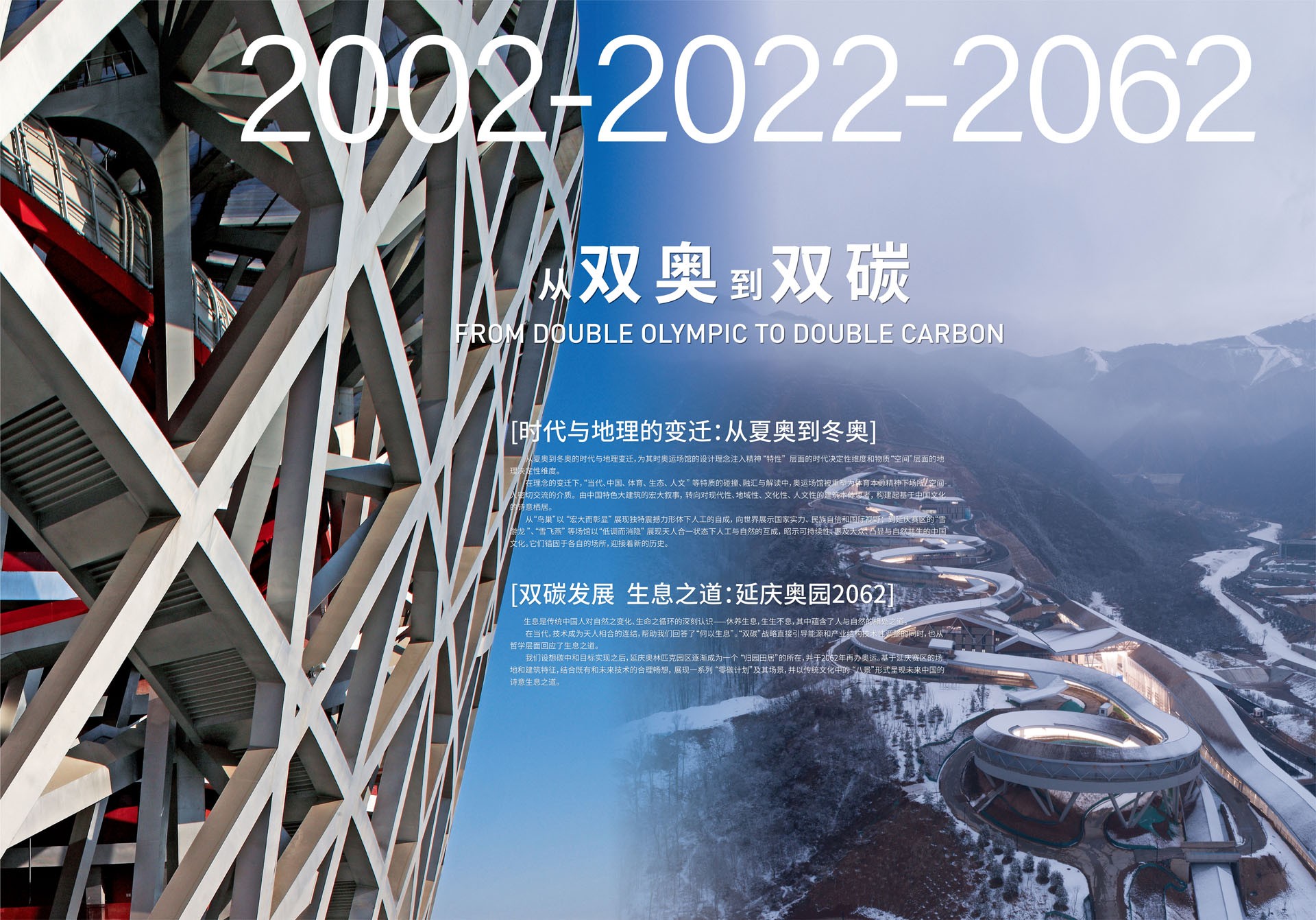 从”鸟巢“以“宏大而彰显”展现独特震撼力形体下人工的自成,向世界展示国家实力、民族自信和国际视野;到延庆赛区的“雪游龙”“雪飞燕”等场馆以“低调而消隐”展现天人合一状态下人工与自然的互成,昭示可持续性、惠及大众、凸显与自然共生的中国文化。它们锚固于各自的场所,迎接着新的历史。 我们设想碳中和目标实现之后,延庆奥林匹克园区逐渐成为了一个“归园田居”的所在,并于2062年再办奥运。基于延庆赛区的场地和建筑特征,结合既有和未来技术的合理畅想,展现一系列“零碳计划”及其场景,并以传统文化中的“八景”形式呈现未来中国的诗意生息之道。