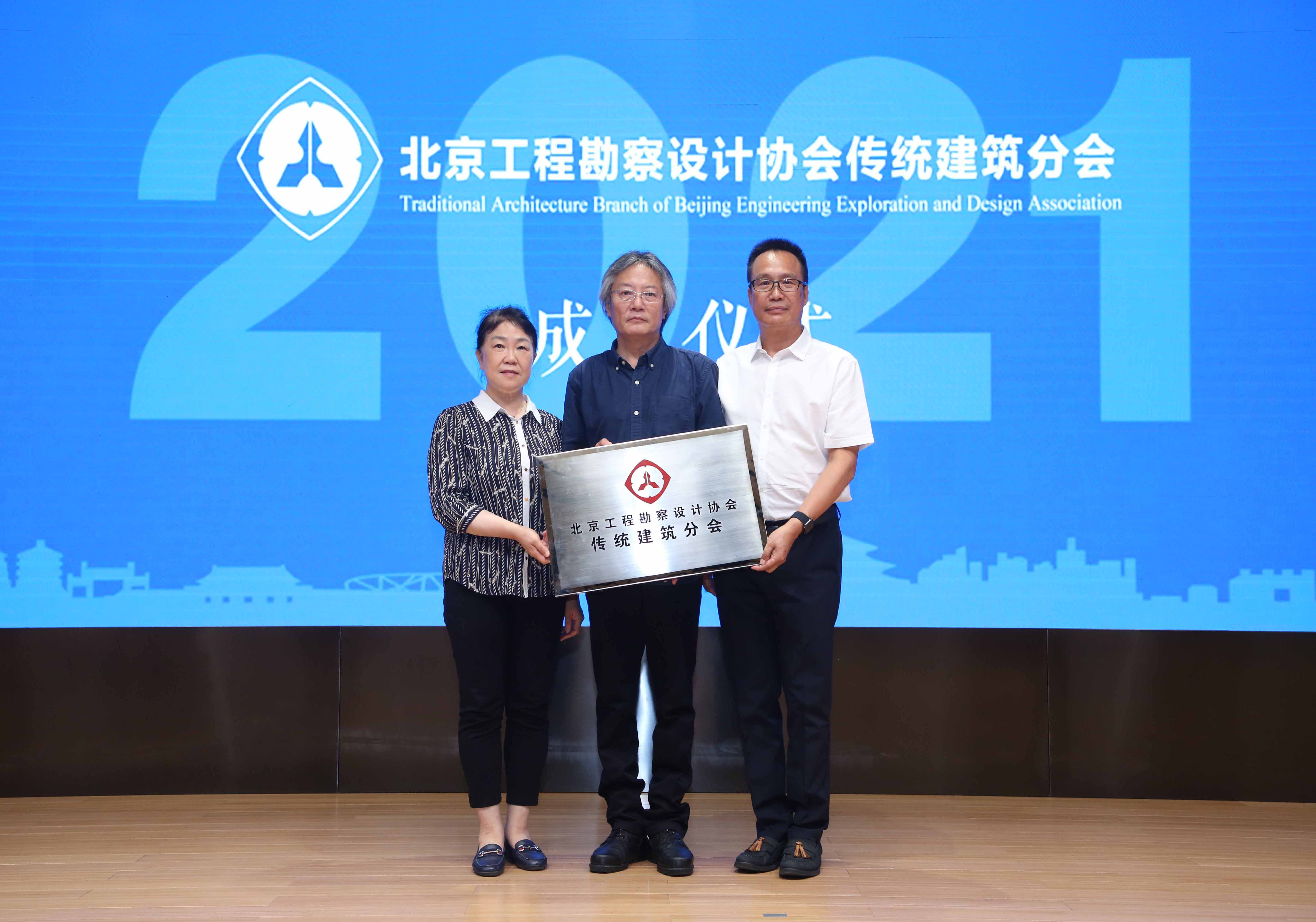 北勘协副会长、中国建筑设计研究院有限公司总经理马海,北勘协秘书长胡颐蘅代表协会向分会筹备单位代表:北勘协传统建筑分会会长、中国建筑设计研究院有限公司建筑历史研究所所长王力军授予协会“传统建筑分会”牌匾。