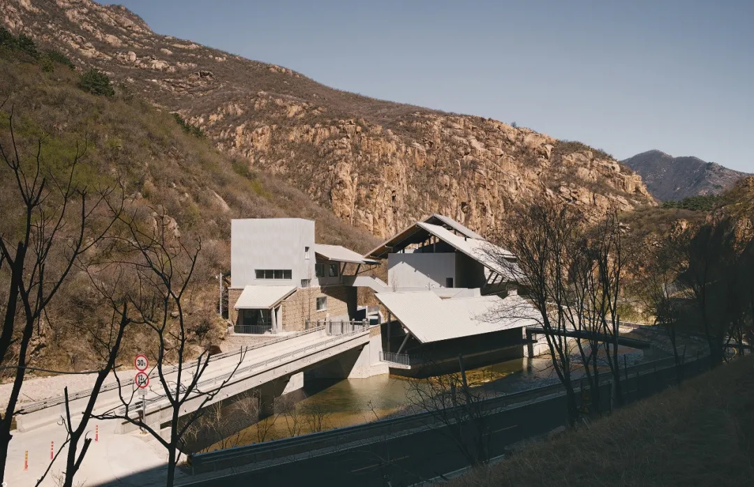造雪引水一级泵站建筑群是造雪引水系统的起点,也是赛区海拔最低的建筑。用地位于海坨山脚下的佛峪口水库管理处,西、北、东三面被远山环抱,北有一抹人工物(佛峪口水库大坝) 点缀,南可远眺张山营镇。内部车道连接北高南低的梯田果园,横向田埂分布其中。
