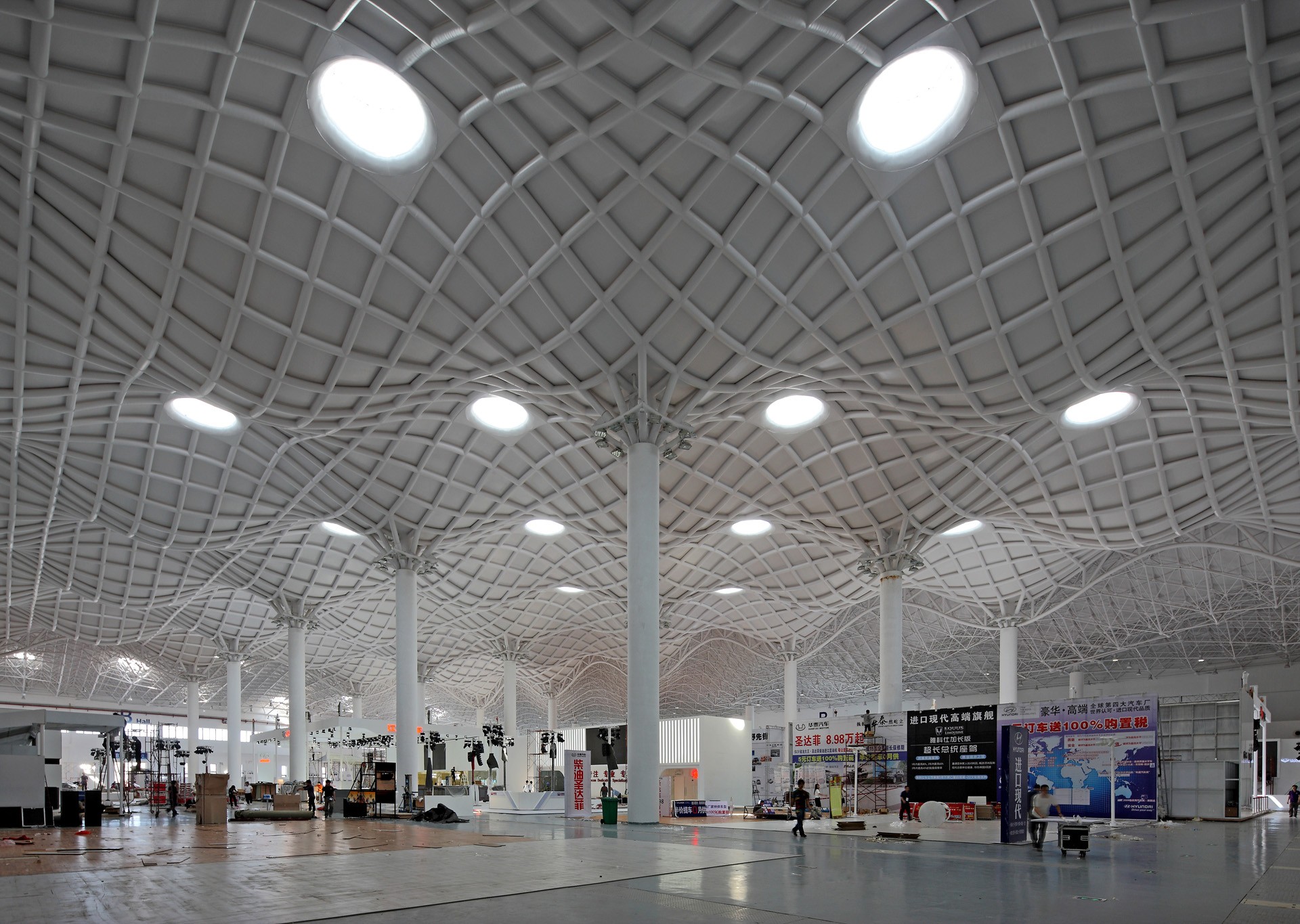 海南国际会展中心位于海口市新的城市组团,北面临海,由展览中心和会议中心及附属设施组成。建筑主体采用一体化的完整造型,将展览和会议功能整合为一个巨大的完形体量,匍匐于海滨,成为城市南北向景观轴线的结束与高潮。建筑造型是处于“像与不像”之间的抽象物,可以看作海水、云团、海洋生物、海上景象等等,似是而非,但总与自然界海洋的气质相契合。起伏波动的屋面壳体钢结构由等截面密格式布置的圆形钢管梁和钢网架组合而成,营造出独特的建筑外观,也与室内空间高度统一,适应不同规模、需求的展览和其他各类功能。