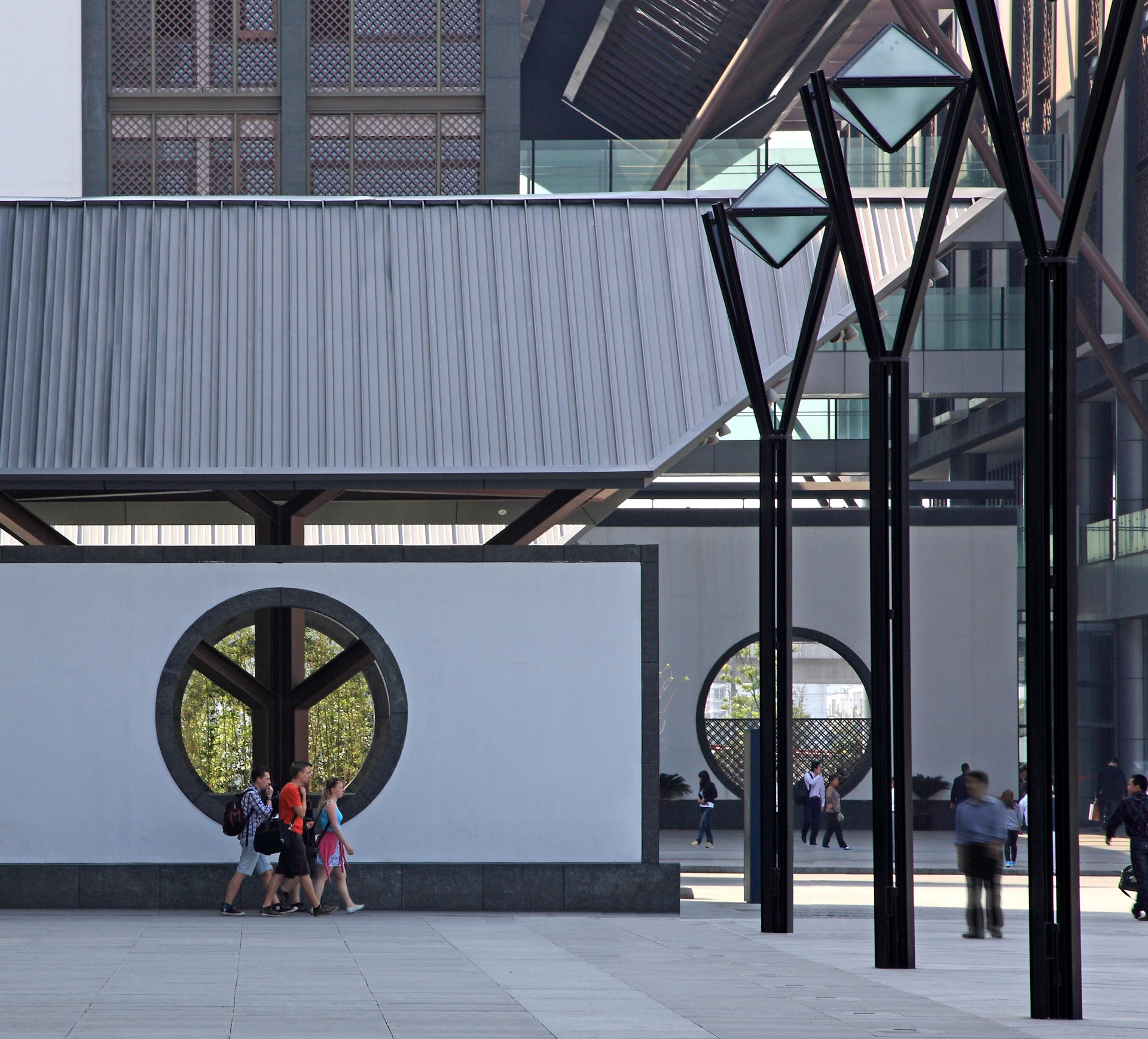 苏州站位于老城北边,隔护城河与姑苏相望。现代化轨道交通系统的发展使老车站难以满足使用要求,需要一个大规模、综合性的交通枢纽取而代之。新站创作的核心问题是如何使庞大的空间体量与苏州细腻、幽雅的小尺度氛围相协调,坚持“苏而新”的本土建筑原则。设计将菱形作为一个符号系统进行发展,从大跨度的站房空间桁架体系,到门窗檐口以及地面铺装的不断演释,再配以白墙黛瓦的苏式淡彩,还有大大小小的苏式庭院和候车敞廊,使这个庞大的现代化车站能够与古城对话,成为城市的有机组成部分。