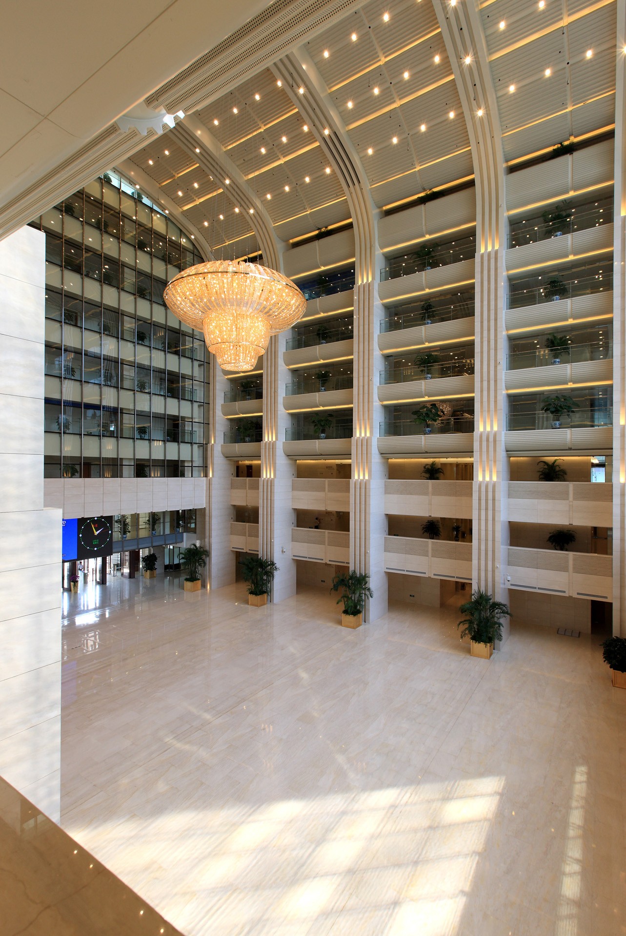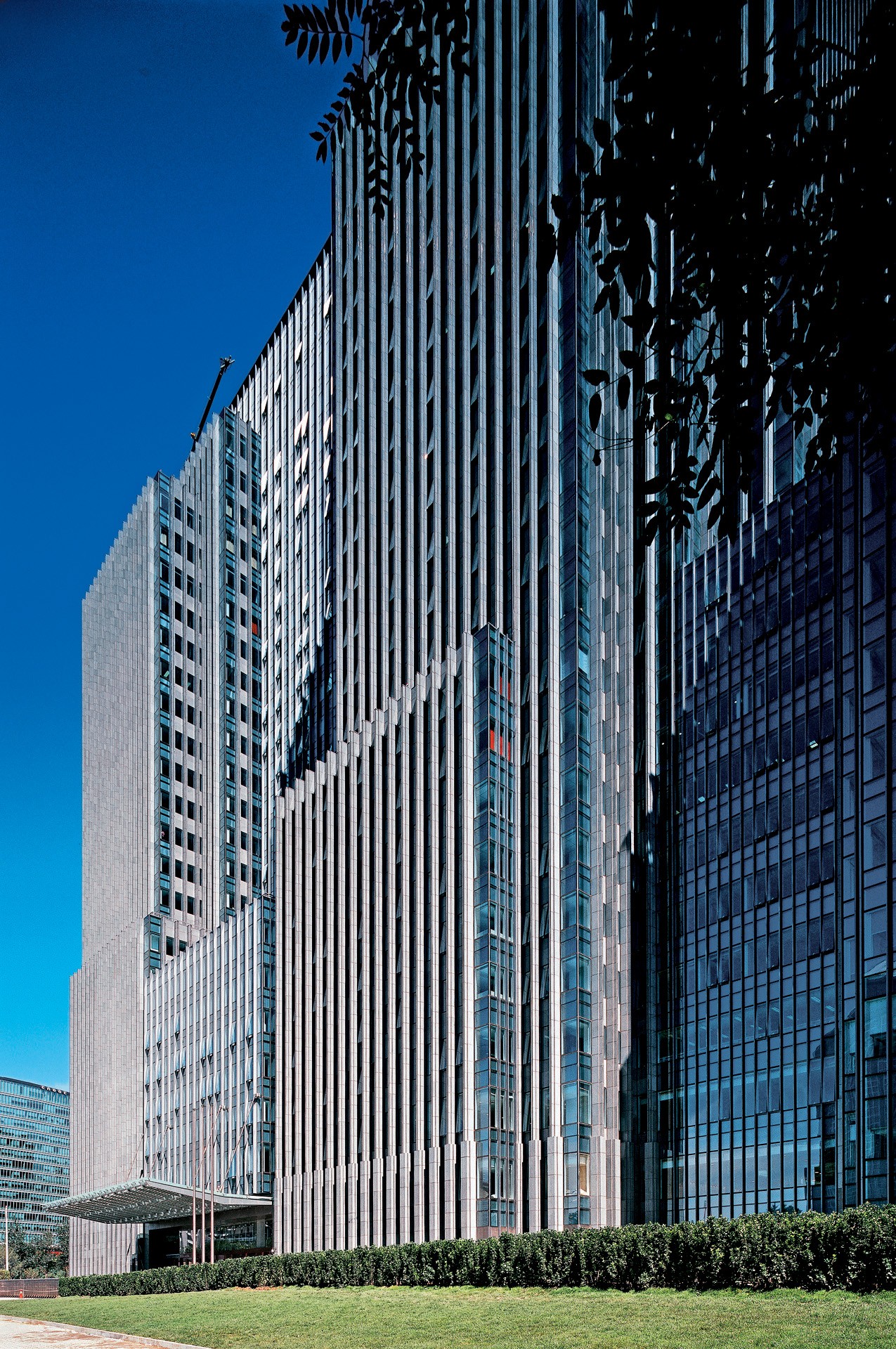 项目位于朝阳门立交桥东北角,由26层的主楼和11层的附楼组成。主楼中设有30m高的中庭空间,其南侧为办公空间,北侧为轻型支撑点接式玻璃幕墙,使得中庭空间明亮透彻,并引入了外观景观。立面设计强调对称及竖向线条,使建筑整体庄重挺拔,不同质感的石材运用及特殊的岩层处理方式,隐喻了石油的提炼过程,以此展示中石化的公司形象。