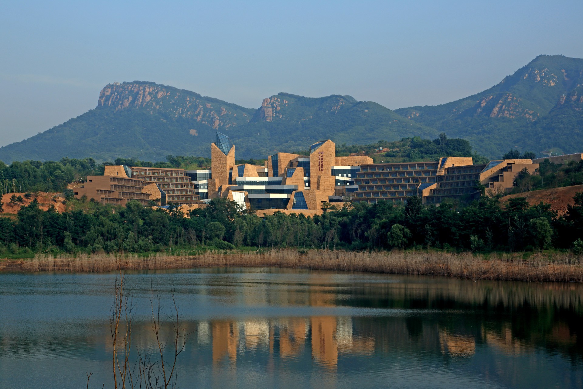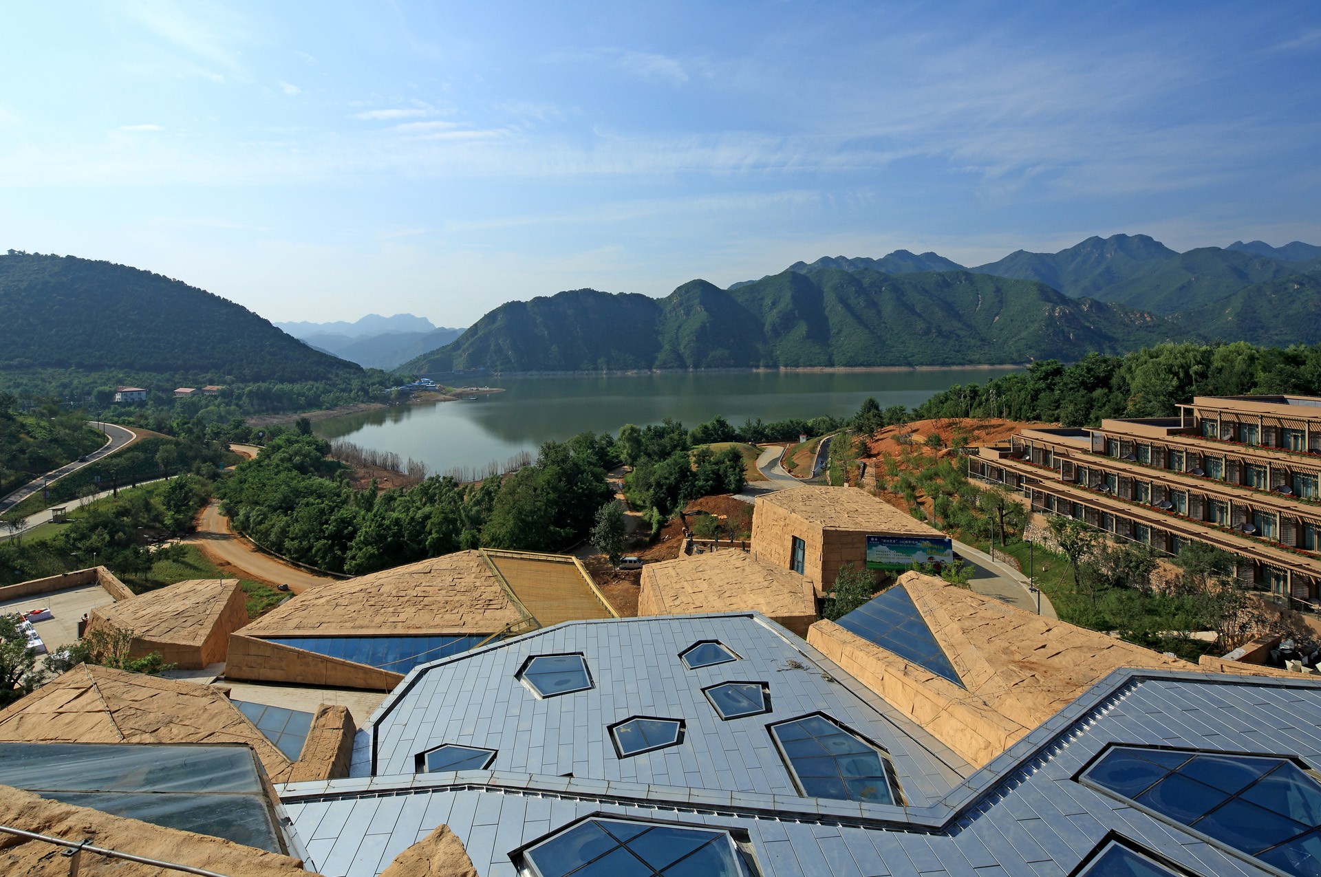 中信金陵酒店位于北京郊外的山坳中,西北侧正对西峪水库。作为一处郊外度假酒店,建筑以“栖山、观水、望峰、憩谷”为主题,依山就势,产生层层跌落的形态,体现出与自然环境的融合。巨大的山石作为基本形态,标志出建筑的公共空间。建筑的中心位置是五层通高的大堂,空间层层叠退,引向内部,上部插入的天窗则如钻石般,产生变幻多姿的光影效果。两侧客房顺山势台阶状跌落,充分利用了山地环境及良好的景观朝向,实现了室内外空间的有机渗透。GRC挂板、生态木和玻璃等材料的搭配运用,赋予建筑粗旷、壮美的外观。