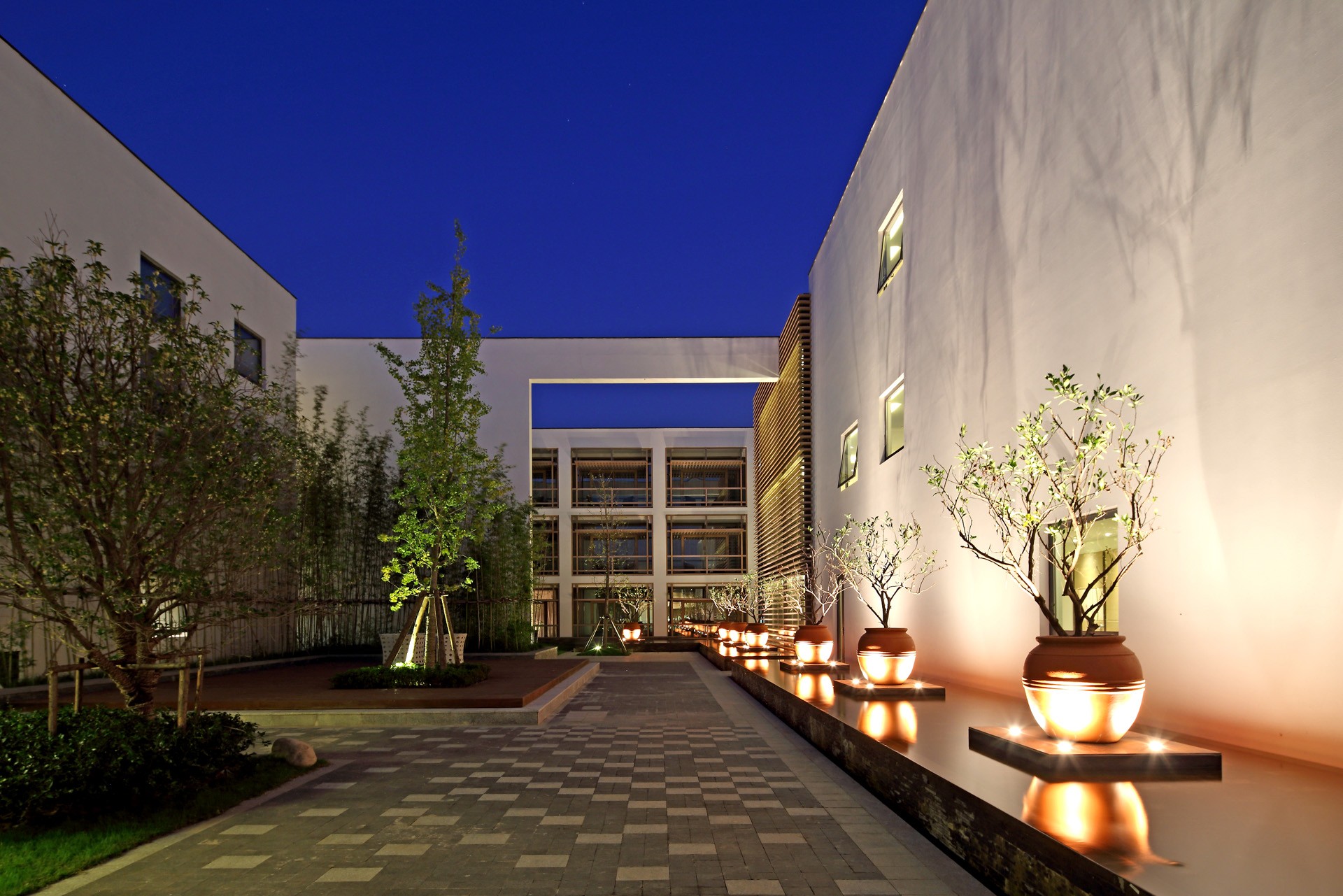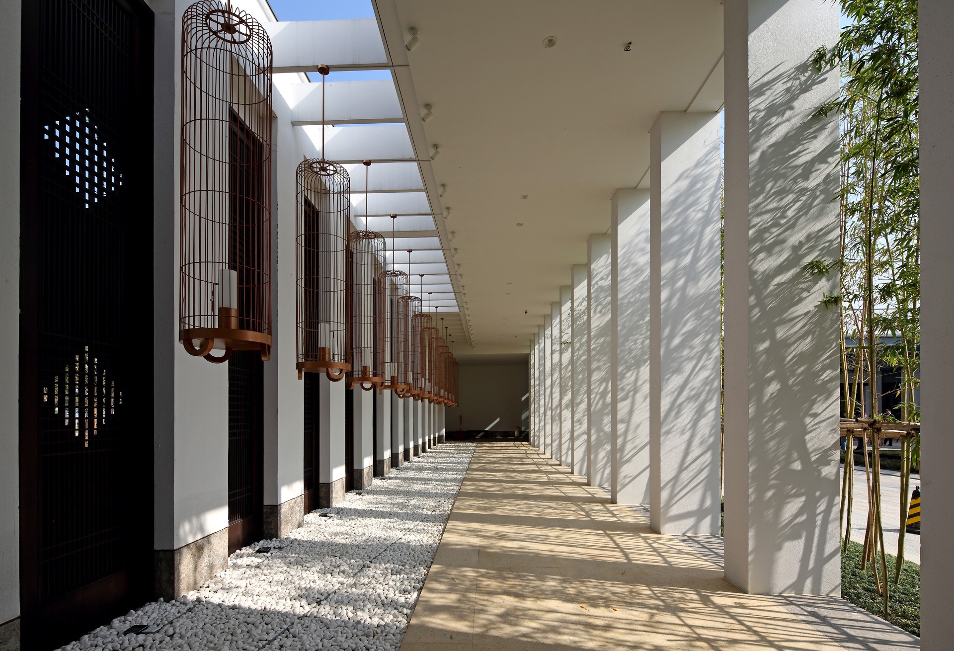 宾馆与朱家角古镇隔大淀湖相望,以若干大小不同的矩形院落的相互交叉嵌套,用方整的单体形成了丰富而生动的聚落式空间。格栅、木窗、片石、竹林等传统元素的运用,均衡而非对称的构图方式,使素白的现代建筑,与江南水乡的传统民居产生了契合。每个院子具有独特的景观和装修形式,并结合陶瓷、竹木、琉璃、砖墙、金属等不同材料形成各自的主题。院落围合和建筑墙体上看似随意的开窗,既来自功能需求,也根据不同景观方向,形成独特的巨幅景框,将自然风景和人文艺术剪裁成迷人的画卷。沿着建筑内部行走其间,江南传统园林的空间形态逐渐展开,现代与传统交织其中。