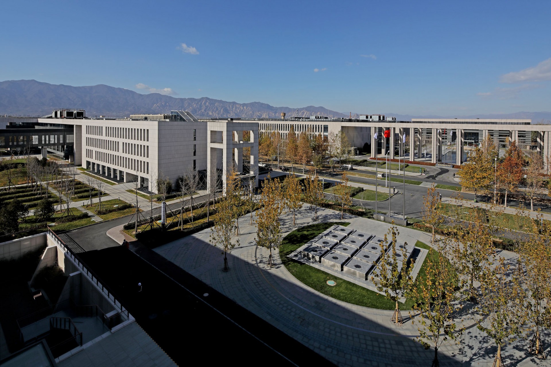 建筑群坐落于北京西山脚下,包含数据机房、研发办公及会议、服务等多组建筑,设有机房区、现场监控区、媒介仓储区、测试区等10 个功能区块。设计以“印”为意,取其信物、凭证之意,与数据处理稳定可靠的要求相契合。单体建筑围合布局,外立面饰以石材,和深窗造型共同构成雕刻效果,组成“国字印”的印章笔画,厚重、坚实的形象更强调了中国农业银行作为四大国有银行之一的重要的行业地位。设计充分运用轴线,以中轴线广场这一景观纽带连接南北两个地块,建筑均围绕广场四周布置。