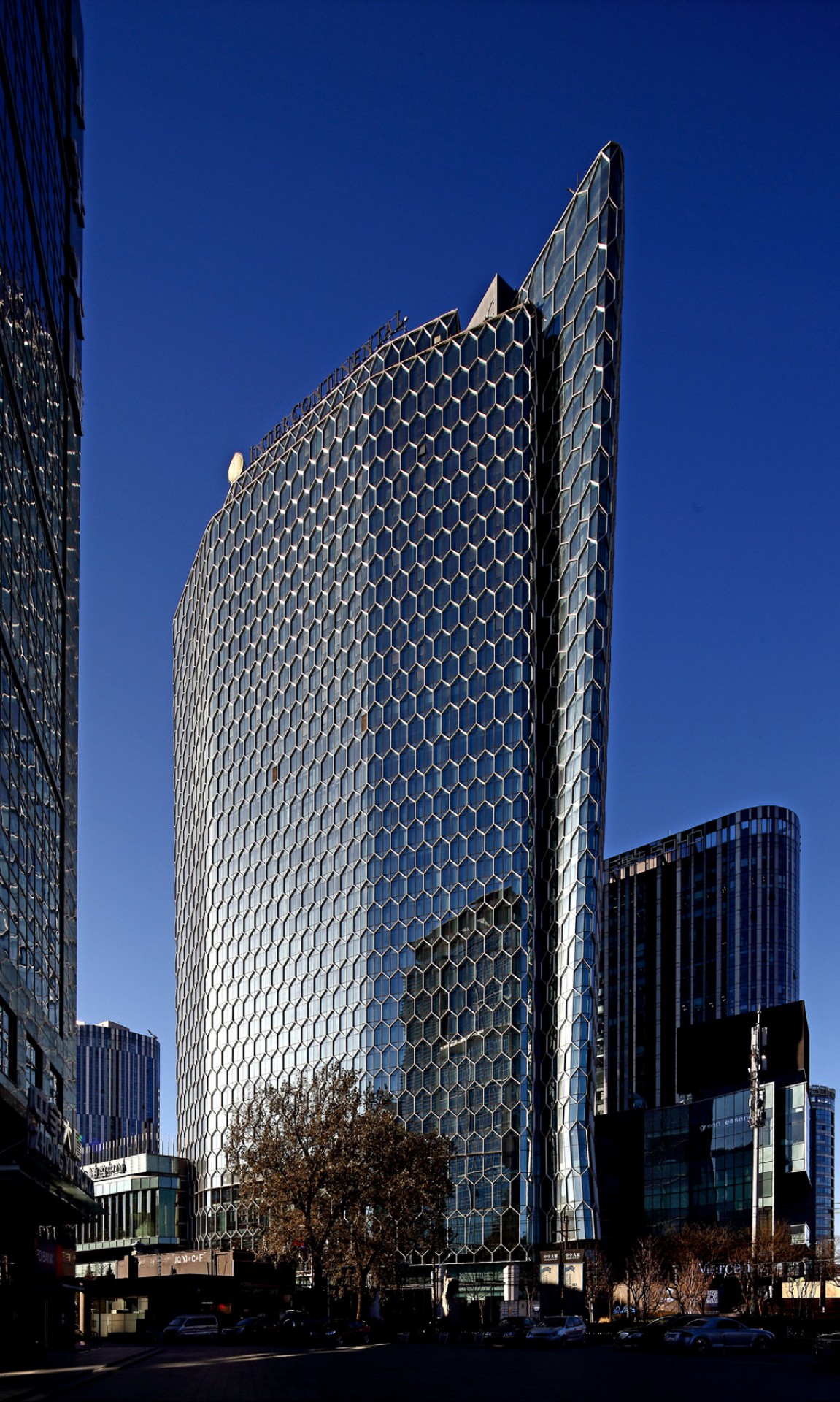 位于北京三里屯地区的通盈中心,是一处由五星级酒店、公寓及高端商业组成的超高层商业综合体建筑。其中的北京三里屯通盈洲际酒店是洲际酒店在北京的旗舰店,其时尚靓丽的外形已成为三里屯的新地标。项目用地为狭窄的长方形,设计在基地面积紧张的情况下,着重解决了酒店复杂的功能流线与周边城市肌理有机融合的问题,使建筑空间和城市空间有机结合,保持了空间的连续性。酒店塔楼外立面采用六角形铝合金型材及Low-E 镀膜玻璃幕墙,形似蜂窝又模仿晶石的结构,结合不同颜色及透光率的玻璃,营造出质感丰富又不失光洁的立面效果,极具雕塑感的体量从周边风格迥异的建筑中脱颖而出。