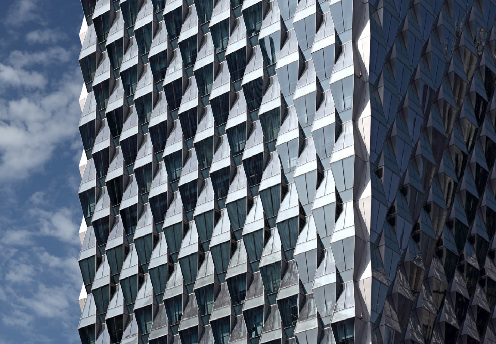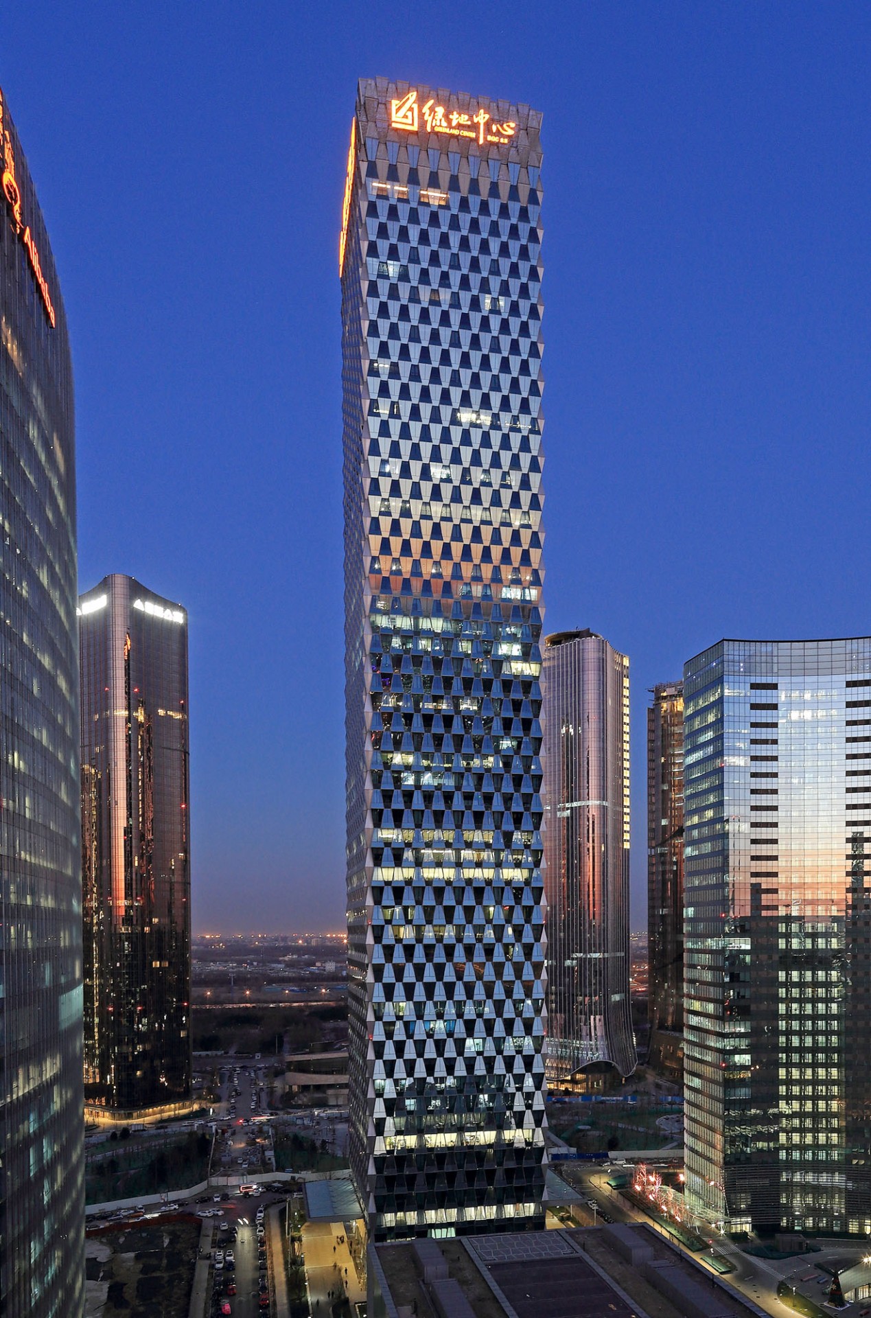 北京绿地中心地处大望京商务区中心位置,靠近机场高速路。设计以“中国锦”的形式为出发点,在外观上呈现出编织交错的肌理,特点突出,富有标志性。其塔楼和裙房分开布置在长条用地的两端。塔楼立面考虑到如何在白天和夜间创造出给人留下深刻印象的特征。模数化的玻璃幕墙单元在塔楼外立面上营造出波浪状此起彼伏的纹理,以不同的角度映衬周边的环境,为塔楼提供一种动态且不断变化的形象。在白天,精心设置的玻璃角度可以起到为室内遮挡阳光的作用,使之成为具备“自行遮阳”能力的超高层建筑。而到了晚上,这种微妙的变化又能折射出迷人的光芒,在夜幕下展现塔楼优雅的轮廓。