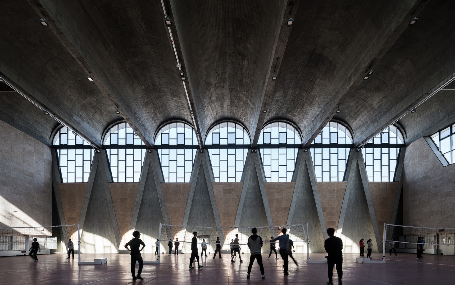 天津大学新校区综合体育馆包含室内体育活动中心和游泳馆两部分,以一条跨街的大型缓拱形廊桥将两者的公共空间连接起来,形成环抱式入口广场。各类室内运动场地依其对平面尺寸、净空高度及使用方式的不同要求,紧凑排列,并以线性公共空间叠加、串联为一个整体,不仅增强了整个室内空间的开放性和运动氛围,而且天然造就了错落多样的建筑檐口高度。运动场地空间的屋顶和外墙,使用了一系列直纹曲面、筒拱及锥形曲面的钢筋混凝土结构,带来大跨度空间和高侧窗采光,在内明露木模混凝土筑造肌理,在外形成沉静而多变的建筑轮廓,达到结构、空间与形式的完美统一。外部材料主要采用清水混凝土结合具有天津大学老校区特色的深棕红色页岩砖饰面。