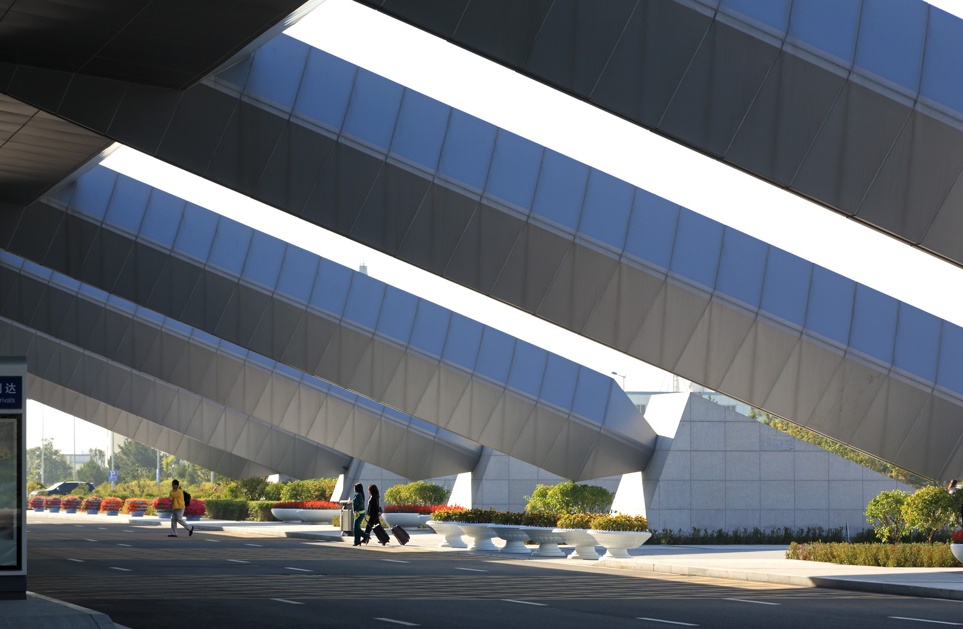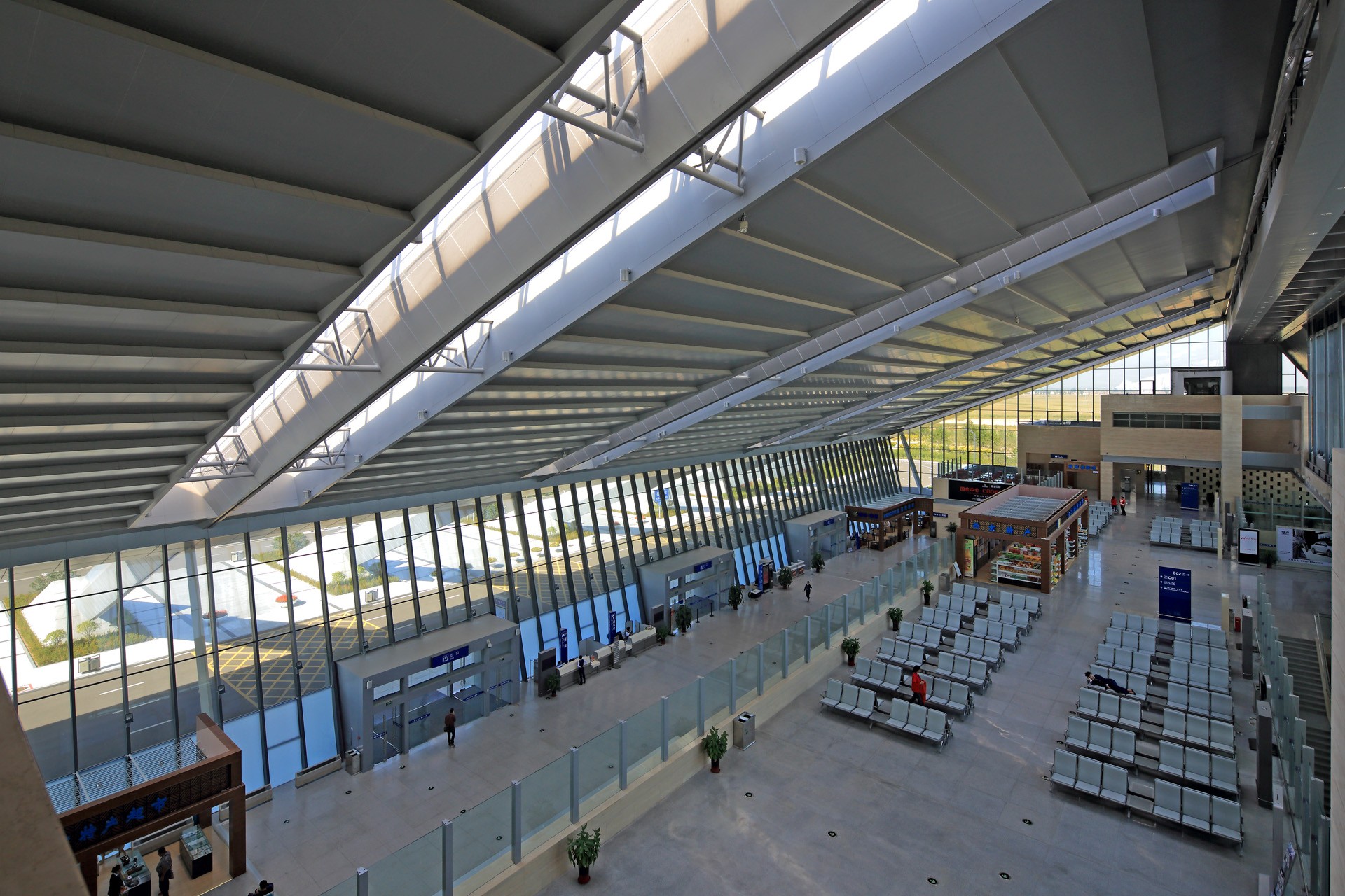 大同机场新航站楼采用前列式布局,体量规模并不大,但是采取小中见大的策略,将各个功能集成于斜向屋顶之下,获得了开敞恢宏的室内空间效果。出发大厅、候机大厅、行李提取大厅通过开放的中庭和屋顶桁架采光廊对话,陆侧和空侧隔而不断,空间连贯。建筑造型提取了山西大同传统建筑硬山屋脊的元素,采取大跨度非对称人字形桁架构成结构主体,倾斜的金属屋面材质和构造极富现代感,空间和气质古拙浑厚,结构形式与建筑造型,建筑功能与室内外空间相互对应形成一体化,形成和通常的机场航站楼截然不同的形象。