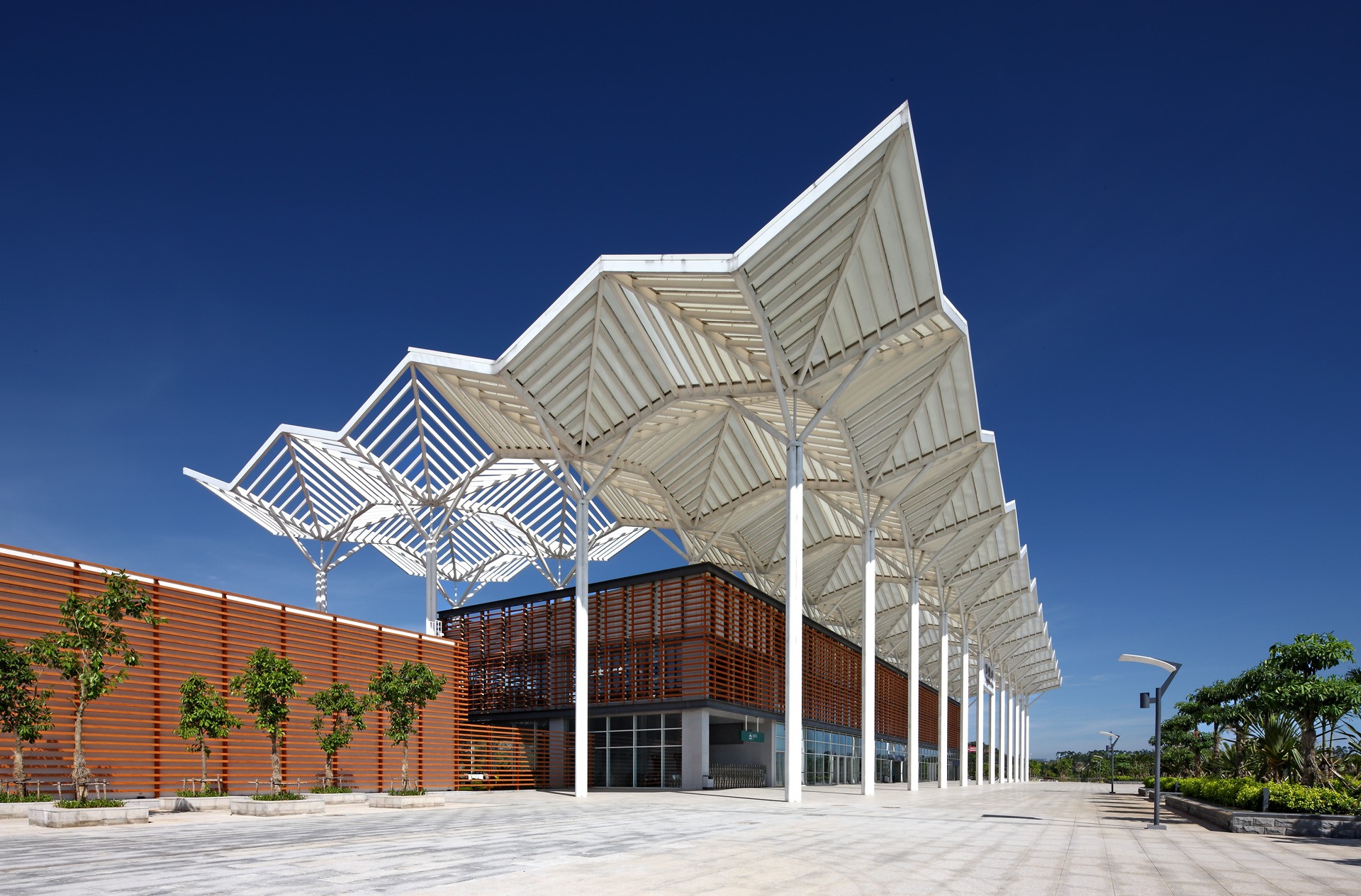 博鳌火车站是海南东环铁路上的重要车站,距博鳌论坛会址10km。设计灵感来源于海南岛成片的椰树林,结合海南的气候条件,在站房前加入一排模仿树干的束状钢结构柱廊,形成可遮阳避雨的半室外空间。建筑外表皮使用柚木色金属遮阳百叶,体现亚热带建筑轻快的特点。白色棚架映衬碧海蓝天,也呼应了博鳌论坛的标志——精美的白帐篷。车站按照功能分成贵宾室、候车厅及设备用房三个独立体块,相互间以院落连接,弱化了通常火车站庞大的体量感,更为适应当地的自然环境。