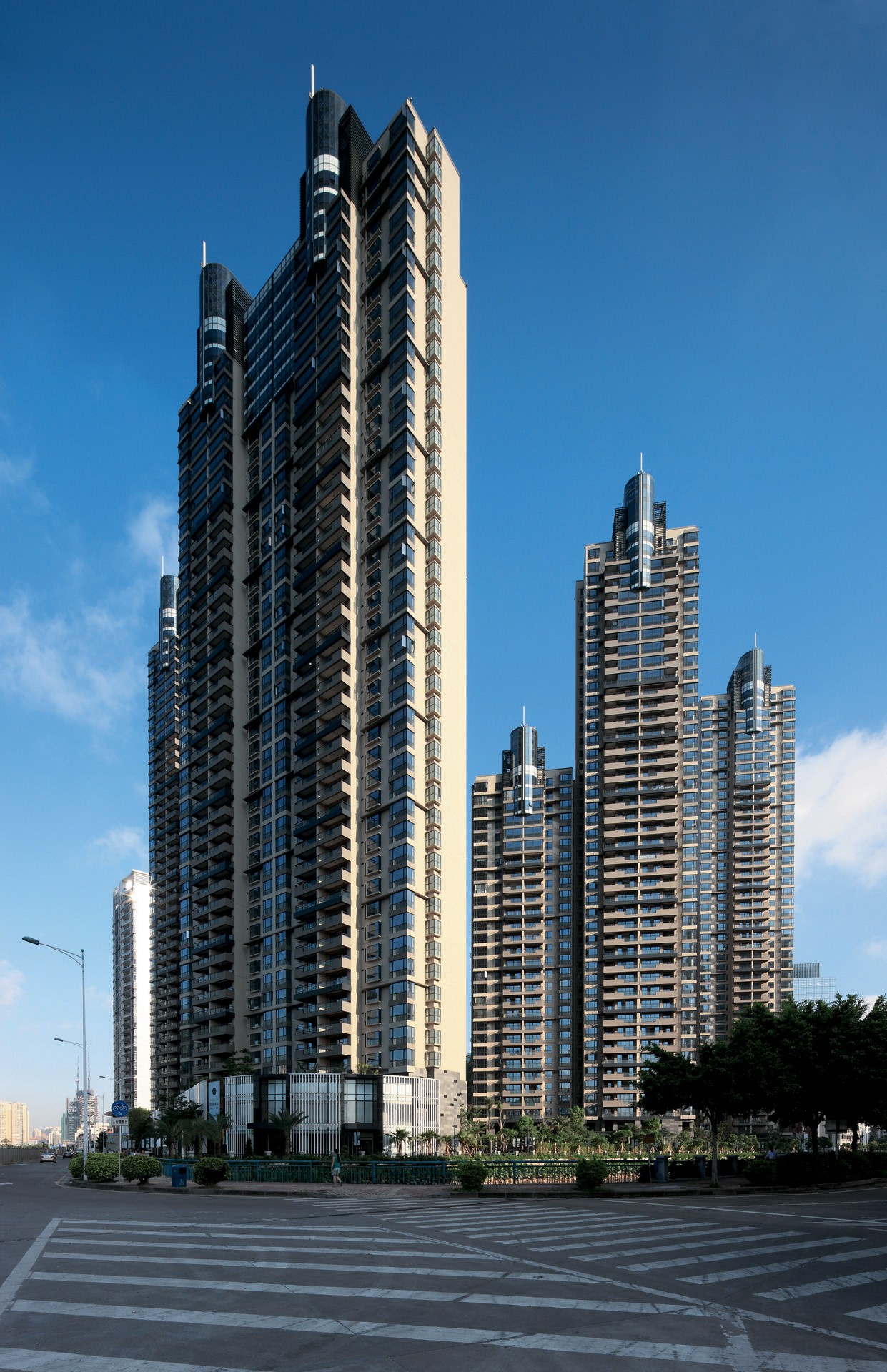 本项目位于广州市珠江新城,包括高层和超高层住宅、会所及配套公建,东南向为珠江公园。建筑布局将面向珠江公园的景观面比例调整至最大化。L形用地中的三幢建筑物偏东南45°,正对珠江公园错开排列,确保每户的东南向景观均无遮挡。超高层大户型位于前排,确保最佳景观资源,并设有设备阳台、双套房、工人房、洗衣房、空中花园,每户独立电梯厅,分设主人与工人电梯,充分保证了私密性。