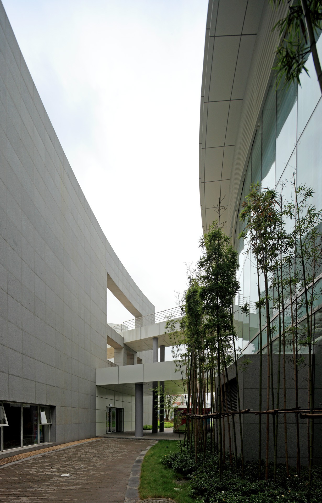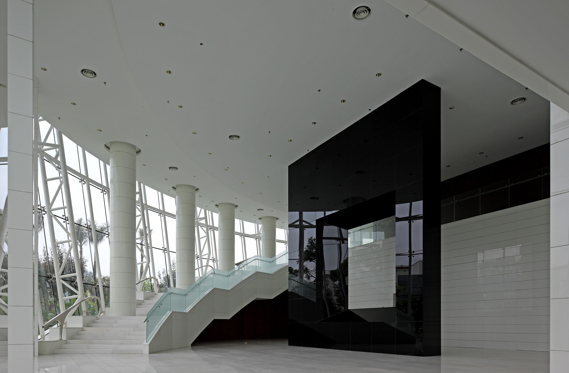 福建广播电视中心位于闽江江畔。电视中心主楼和广播中心主楼沿江滨大道布置,形成良好的沿江景观,电视台演播大厅则沿用地北侧自然展开。建筑外形舒展轻盈,隔江远眺如白色航船行于碧波之上。为确保声学效果,节目录制部分主要为实墙,沿江的办公空间则采用玻璃幕墙与遮阳百叶。公众参观流线由江滨进入,经中央广场和演播厅,自东侧的大台阶离开,确保公众充分体验广电中心的特色,又避免与演职人员流线产生干扰。
