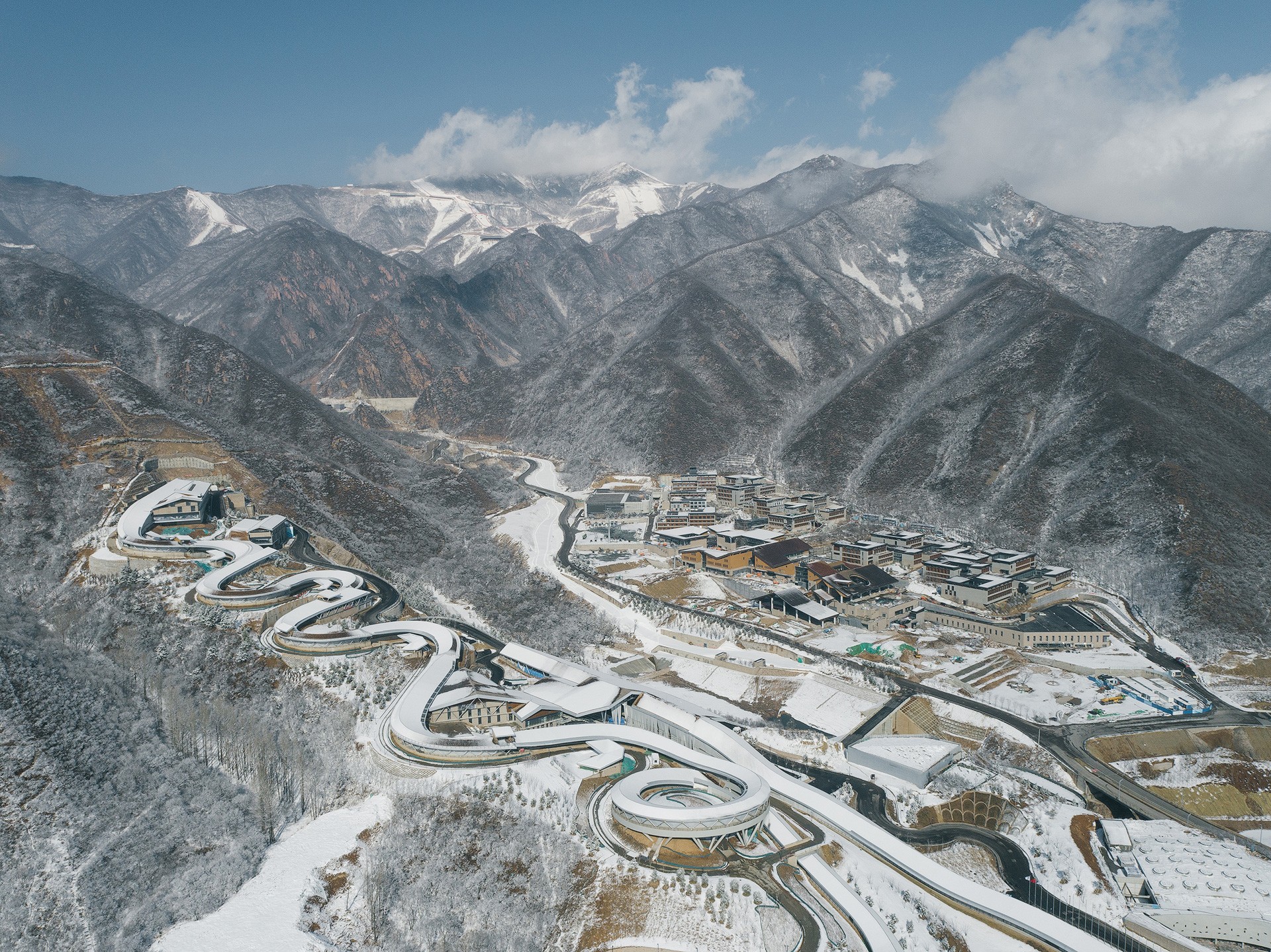 雪车雪橇项目是冬奥会中速度最快的项目,被誉为冰雪运动中的F1方程式。国家雪车雪橇中心拥有目前中国唯一雪车雪橇赛道,赛道长度1975m,设置16个弯道,拥有一个超大尺度360°螺旋弯,最高速度135km/h,最大加速度4.9g。设计团队自主研发了地形气候保护系统、赛道一体化成型和喷射混凝土材料和工法,以及单边最大悬挑12.65m的装配式钢木组合结构遮阳棚,为“雪游龙”在山林间自由地蜿蜒创造了充分的物质条件。